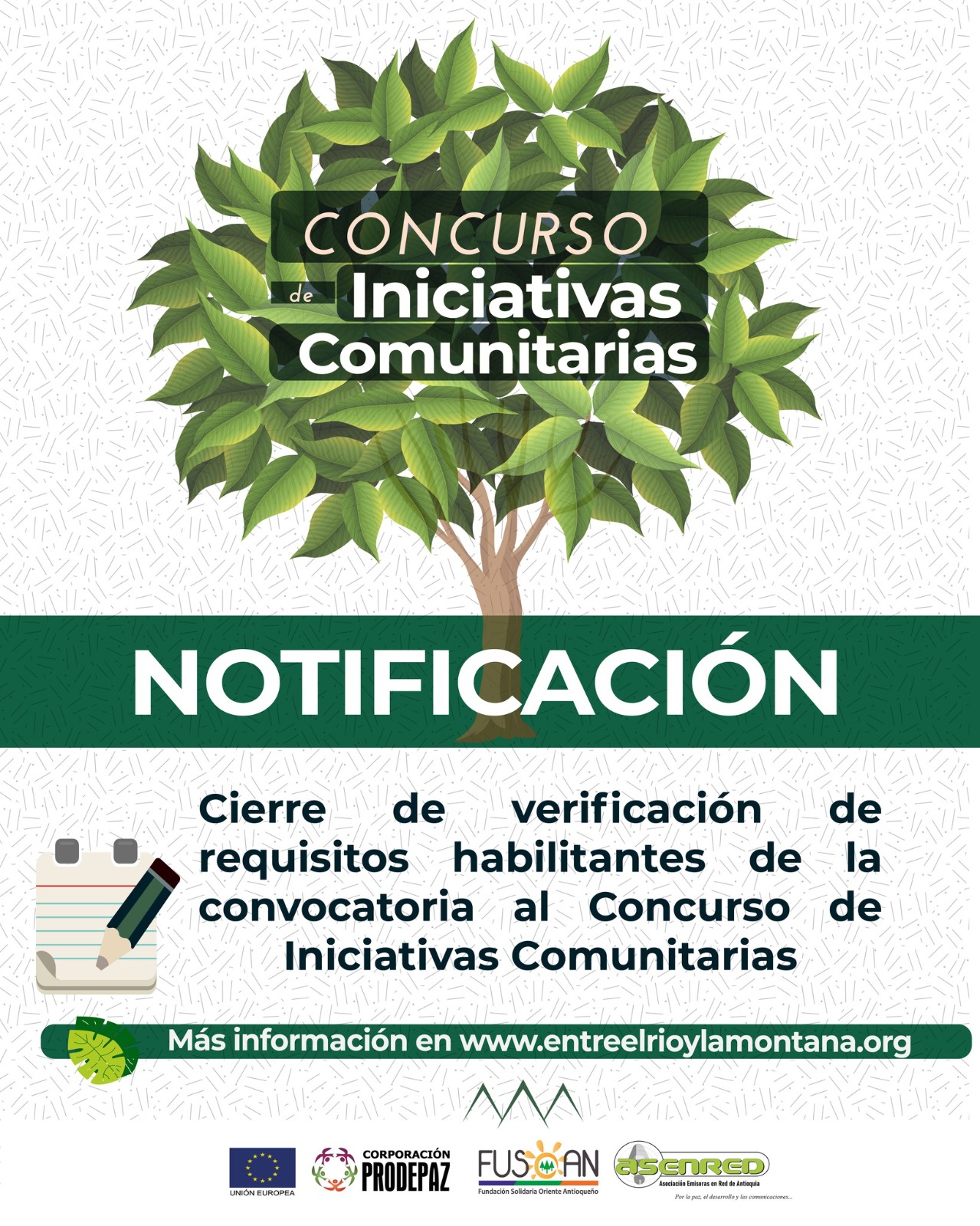 Dando cumplimiento a lo establecido en el documento de Términos de Referencia, presentamos notificación de cierre de verificación de requisitos habilitantes de la convocatoria al Concurso de Iniciativas Comunitarias “Entre el Río y la Montaña” del contrato de subvención acciones exteriores de la Unión Europea- NDICI CSO/2022/441-131:” “Entre el río y la montaña: Gobernanza territorial y desarrollo sostenible en las cuencas del Samaná Norte y el Magdalena Medio Colombiano»”.
